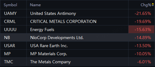 UAMY fell 22%; Critical Metals fell 20%; Energy Fuels fell 16%; NioCorp Developments fell 15%; USA Rare Earth fell 14%; MP Materials fell 10%.