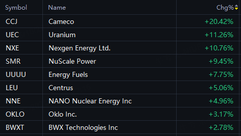 Nuclear stocks rose in Tuesday trading. Cameco up 20%; NexGen Energy, Uranium up 11%; NuScale Power up 9%; Energy Fuels up 8%; Nano Nuclear, Centrus up 5%.