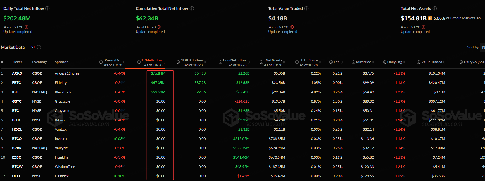 The Bitcoin spot ETF with the highest net inflow on Oct. 28 was ARK 21Shares Bitcoin ETF , with a net inflow of $75.84 million. Followed by Fidelity Wise Origin Bitcoin Fund, with a net inflow of 67.05 million, according to SoSoValue.