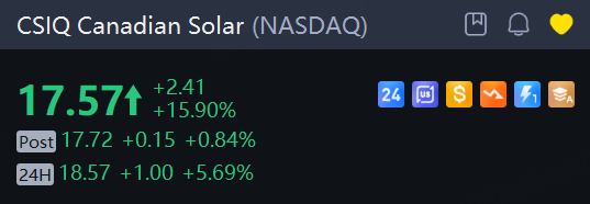Canadian Solar shares gained another 5.7% in overnight trading. The shares surged 15.9% on Wednesday, marking its largest intraday gain since April, as positive earnings results from industry peers lifted sentiment across the Chinese solar sector. The rally comes as several Chinese solar companies reported better-than-expected financial results, sparking optimism for a potential turning point in the industry.