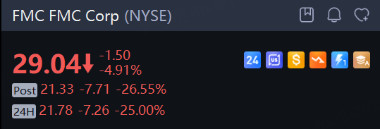 Agrichemicals company FMC Corp on Wednesday forecast lower-than-expected adjusted profit for the year after reporting a third-quarter loss, sending its shares down 25% in overnight trading. Earlier this year, the company said it would divest its commercial business in India, in response to challenges in the country.