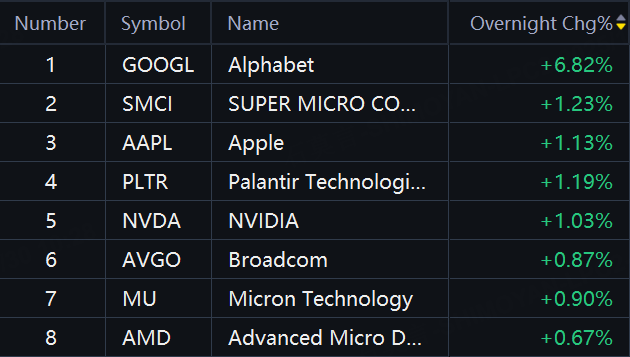 Some big tech stocks gained in overnight trading. Apple, Nvidia, SMCI, PLTR up over 1%.