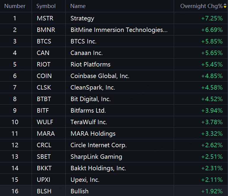 Crypto shares jumped in overnight trading. Strategy up 7%; BitMine up over 6%; BTCS, Canaan, Riot Platforms up over 5%; Coinbase, CLSK, Bit Digital up over 4%.