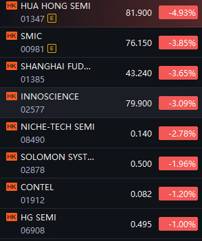 HK Chip Stocks Dropped. Hua Hong Semiconductor down 5%; SMIC, Innoscience and Shanghai Fudan down 3%; Niche-Tech Semi and Solomon Systech down 2%.