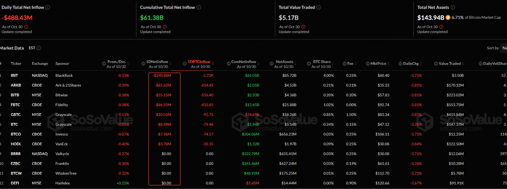 The Bitcoin spot ETF with the highest net outflow on Oct. 30 was iShares Bitcoin Trust ETF , with a net outflow of $290.88 million. Followed by Cboe Global Markets, Inc , with a net outflow of 65.62 million, according to SoSoValue.