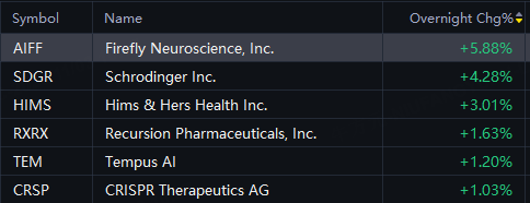 Medical AI stocks rose in overnight trading. Firefly Neuroscience rose 6%; Schrodinger up 4%; Hims & Hers Health up 3%; RXRX up 2%; Tempus AI up 1%.