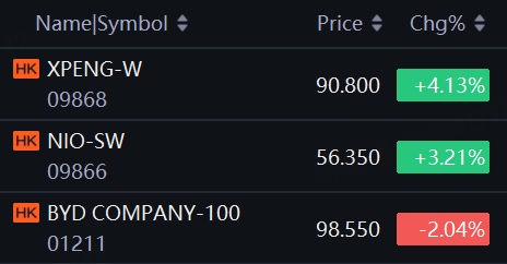 EV shares mixed in Hong Kong. XPeng up 4%; NIO up over 3%; BYD Company fell 2%.