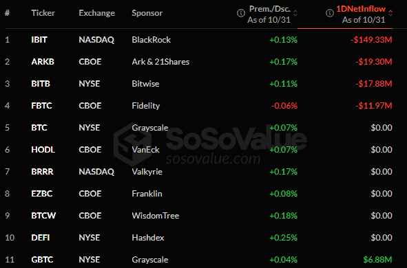 The Bitcoin spot ETF with the highest net outflow on Oct. 31 was iShares Bitcoin Trust ETF , with a net outflow of $149.33 million. Followed by Cboe Global Markets, Inc (CBOE), with a net outflow of 19.30 million, according to SoSoValue.