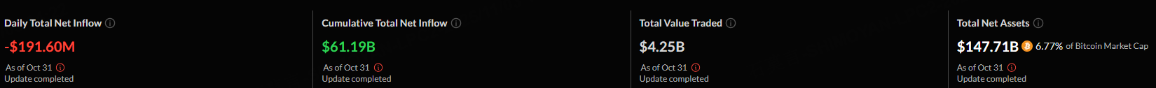 The overall net outflow of the US Bitcoin spot ETF on Friday (Oct. 31) was $191.6 million. The total net asset value of Bitcoin spot ETFs is $147.71 billion, and the ETF net asset ratio (market value compared to total Bitcoin market value) is 6.77%.
