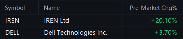 IREN shares soared 20% in premarket trading, while Dell jumped 3.7%.