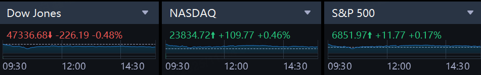 The Dow Jones Industrial Average .DJI fell 226.19 points, or 0.48%, to 47,336.68, the S&P 500 .SPX gained 11.77 points, or 0.17%, to 6,851.97 and the Nasdaq Composite .IXIC gained 109.77 points, or 0.46%, to 23,834.72.