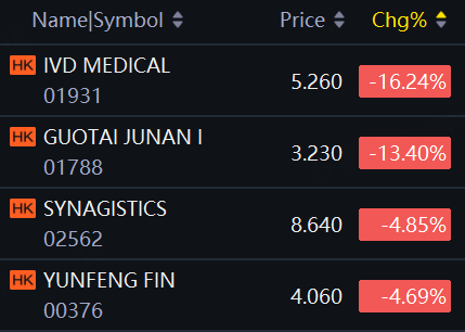 Hong Kong’s stablecoin stocks fell on Tuesday. IVD Medical down 16%; Guotai Junan International down 13%; Synagistics, Yunfeng Fin down over 4%.
