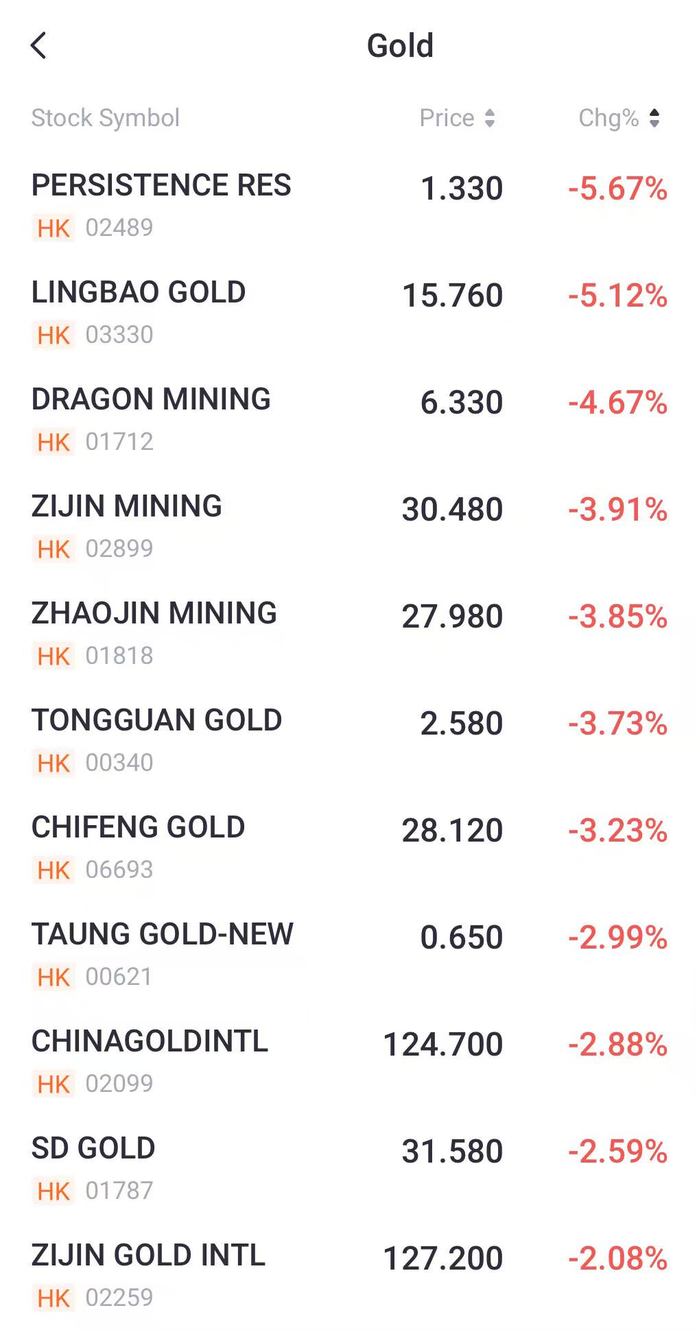 Gold stocks fell on Tuesday. Persistence Res, Lingbao Gold down over 5%; Dragon Mining, Zijin Mining, Zhaojin Mining down around 4%.