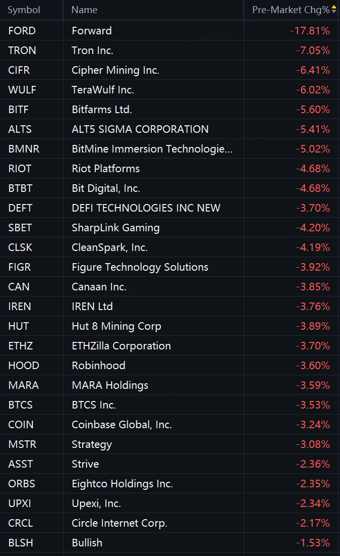 Crypto stocks dropped as crypto fell on reduced U.S. rate cut bets, balancer hack. Forward fell 18%; Tron fell 7%; Cipher Mining, TeraWulf, and Bitfarms fell 6%; BitMine, Riot Platforms, and Bit Digital fell 5%; SharpLink Gaming, CleanSpark, Figure, IREN, and MARA Holdings fell 4%; Coinbase and Strategy fell 3%.