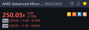 Advanced Micro Devices fell 4% in overnight trading.
