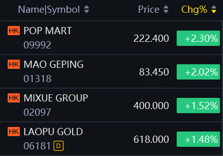 New consumption socks jumped in Hong Kong. Pop Mart, Mao Geping up over 2%; Mixue Group, Laopu Gold up over 1%.