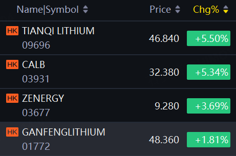 Lithium stocks jumped in Hong Kong. Tianqi Lithium, CALB up over 5%; Zenergy up over 3%; Ganfeng Lithium up about 2%.