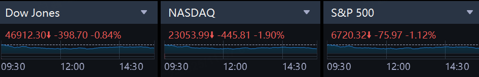 The Dow Jones Industrial Average .DJI fell 397.35 points, or 0.84%, to 46,913.65, the S&P 500 .SPX lost 75.91 points, or 1.12%, to 6,720.38 and the Nasdaq Composite .IXIC lost 445.80 points, or 1.90%, to 23,053.99.
