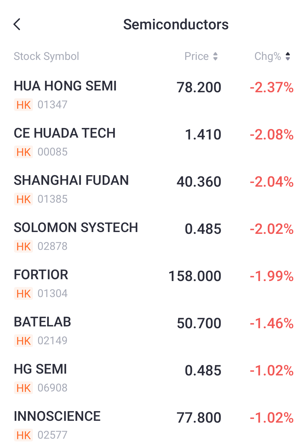 Semiconductor stocks fell in Hong Kong. Hua Hong Semi, CE Huada Tech, Shanghai Fudan, Solomon Systech, Fortior down 2%.