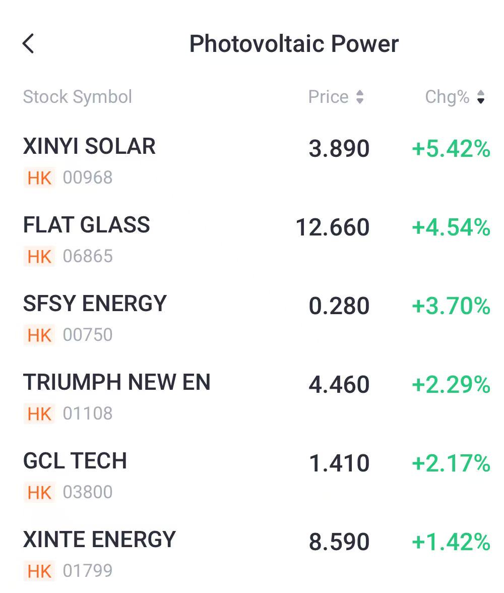 Photovoltaic shares jumped in Hong Kong. Xinyi Solar up over 5%; Flat Glass, SFSY Energy up around 4%; Triumph New En, GCL Tech up over 2%.