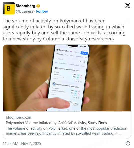 Polymarket, a leading crypto prediction market platform, has seen significant inflation of its trading volume due to “artificial” wash trading, a new Columbia University study uncovers.