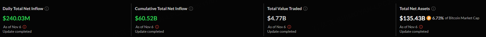 The overall net outflow of the US Bitcoin spot ETF on Thursday (Nov. 6) was $240 million. The total net asset value of Bitcoin spot ETFs is $135.43 billion, and the ETF net asset ratio (market value compared to total Bitcoin market value) is 6.73%.
