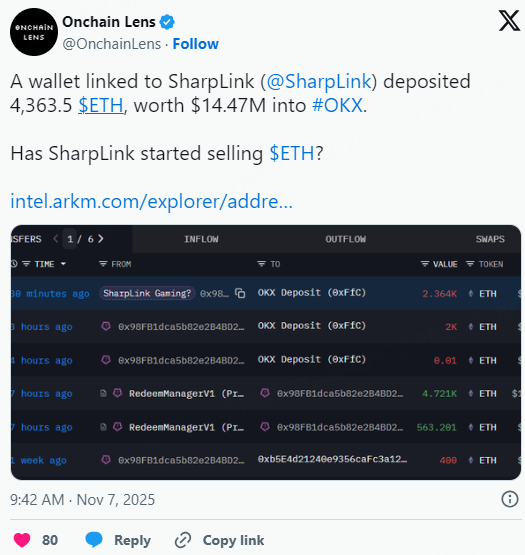 On-chain data flagged by Lookonchain shows a wallet associated with SharpLink Gaming redeemed 5,284 ETH worth roughly $17.5 million, before transferring about 4,364 ETH (around $14.5 million) to OKX. The movement suggests potential liquidity or realization activity, drawing attention amid broader market volatility.