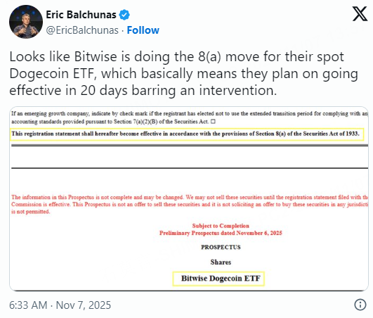 Bloomberg Senior ETF Analyst Eric Balchunas noted that Bitwise has submitted an 8(a) filing for its proposed Spot Dogecoin ETF. The 8(a) form triggers an automatic approval window, meaning the ETF would be cleared for listing after 20 days unless the SEC steps in to delay or block it. The move signals Bitwise’s push to expand the roster of spot crypto ETFs beyond Bitcoin and Ethereum, bringing a major meme asset closer to regulated exchange trading if approved.