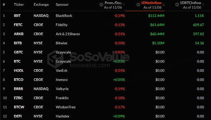 The Bitcoin spot ETF with the highest net inflow on Nov. 6 was iShares Bitcoin Trust ETF, with a net inflow of $112.44 million. Followed by Fidelity Wise Origin Bitcoin Fund, with a net inflow of $61.64 million, according to SoSoValue.
