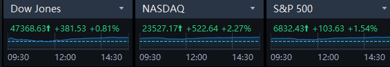 The S&P 500 climbed 1.54% to end the session at 6,832.43 points. The Nasdaq gained 2.27% to 23,527.17 points, its biggest one-day percentage gain since May 27. The Dow Jones Industrial Average rose 0.81% to 47,368.63 points. Navitas Semiconductor Corp up 22%; Opendoor Technologies Inc up 21%; XPeng Inc. up 16%; SanDisk Corp. up 12%.