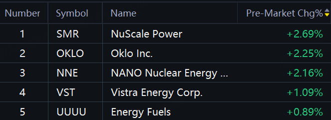 Nuclear stocks jumped in premarket trading. Nuscale Power, Oklo, NANO Nuclear Energy jumped over 2%; Vistra Energy up 1%.