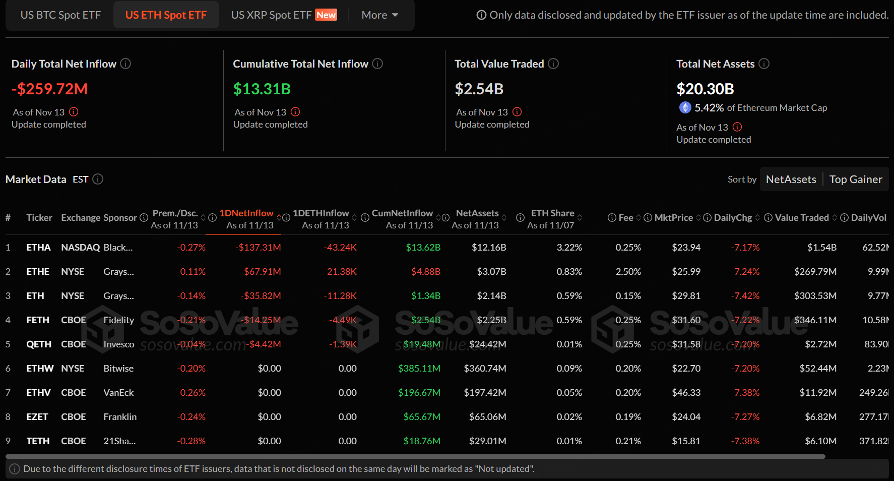 The Ethereum spot ETF with the highest net outflow on November 13 was iShares Ethereum Trust ETF, with a net inflow of $137.31 million, according to SoSoValue.