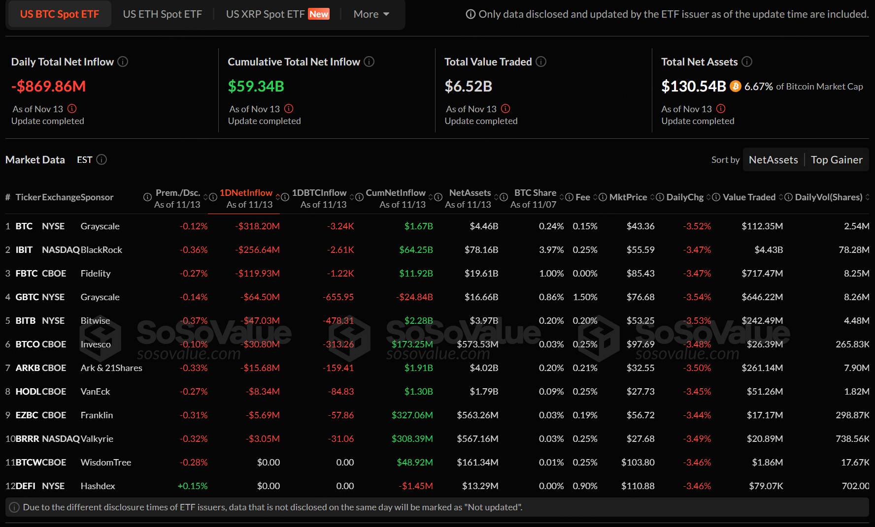 The Bitcoin spot ETF with the highest net outflow on November 13 was Grayscale Bitcoin Mini Trust ETF (BTC), with a net outflow of $318.2 million, according to SoSoValue.