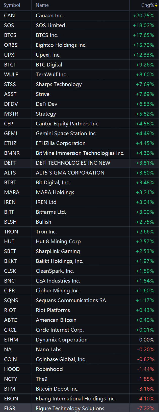 TeraWulf rose 9%; Strategy rose 6%; MARA Holdings, IREN, Bitfarms, and Bullish rose 3%; while Coinbase fell 0.8%, Robinhood fell 1%.