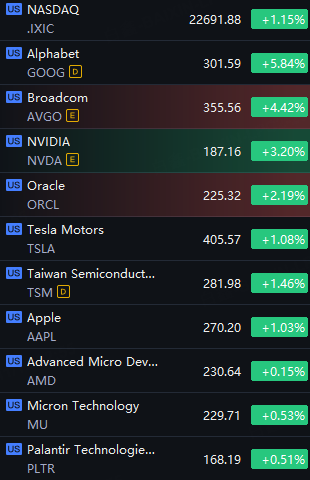 Big tech stocks gained. Nasdaq up 1%; Alphabet up 6%; Broadcom up 4%; Nvidia up 3%; Oracle up 2%; Tesla, TSMC and apple up 1%.