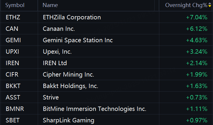 Some Crypto stocks rebounded in overnight trading. IREN and Cipher Mining rose 2%; BitMine rose 1%.