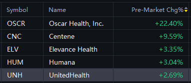 Oscar Health up 22%; Centene up 10%; UnitedHealth, Elevance Health, Humana up 3%.