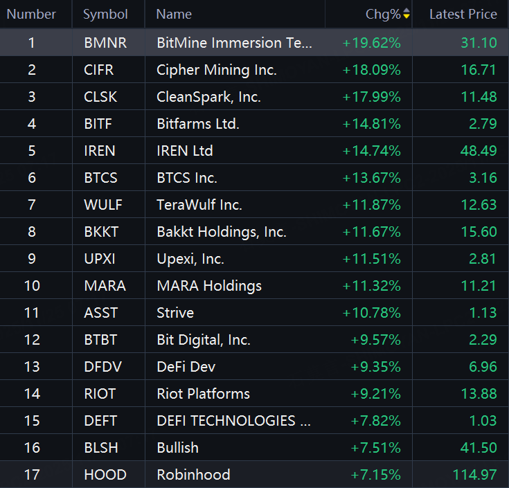 Crypto shares surged on Monday. BitMine up nearly 20%; Cipher Mining, CleanSpark up 18%; Bitfarms up 15%; BTCS up 14%; TeraWulf up 12%; Bakkt Holdings, Upexi up over 11%.