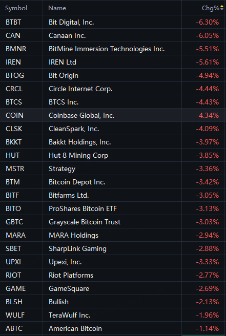 BTBT, IREN, BMNR, Canaan fell 6%; Circle, BTCS, Coinbase fell 4%; Strategy fell 3%.