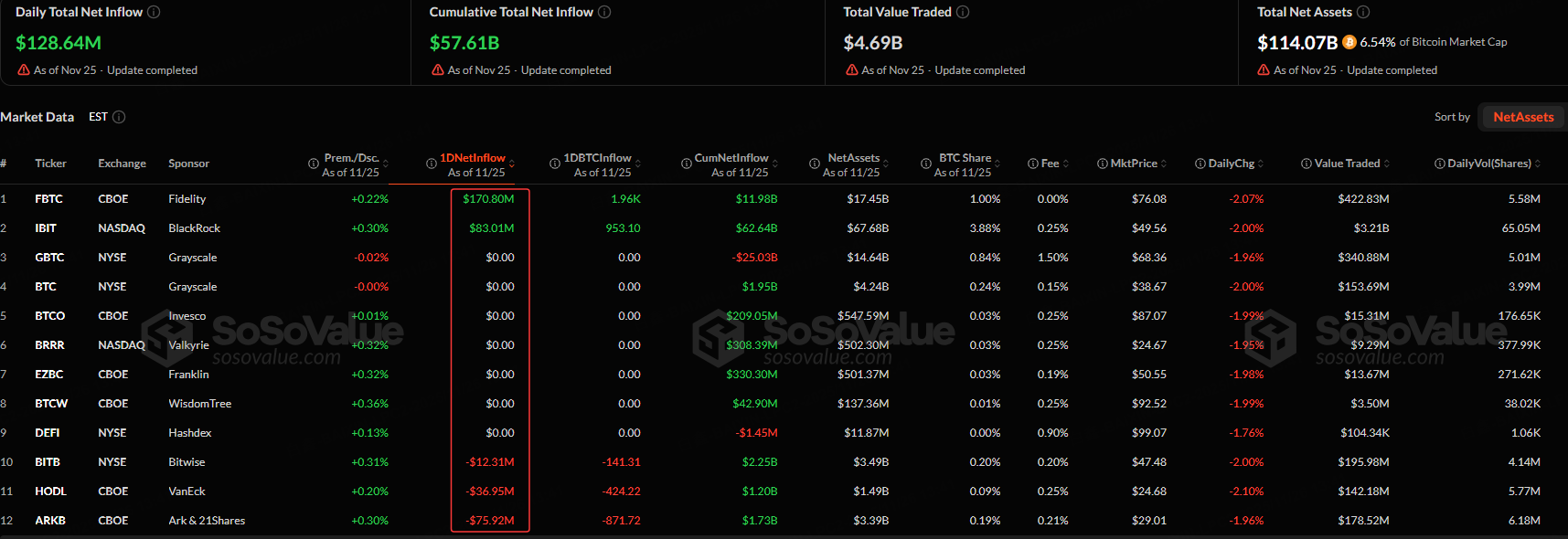 The Bitcoin spot ETF with the highest net inflow on Nov. 25 was Fidelity Wise Origin Bitcoin Fund, with a net inflow of $170.8 million. Followed by iShares Bitcoin Trust , with a net inflow of 83.01 million, according to SoSoValue.