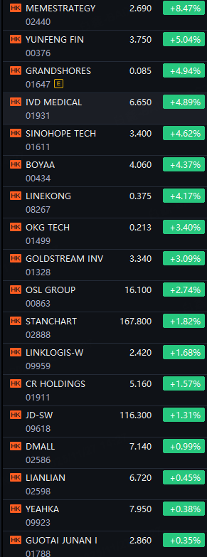 HK Crypto Stocks Gained. Memestrategy up 8%; Yunfeng Fin, IVD Medical and Grandshores up 5%; Boyaa, Sinohope and Linekong up 4%.