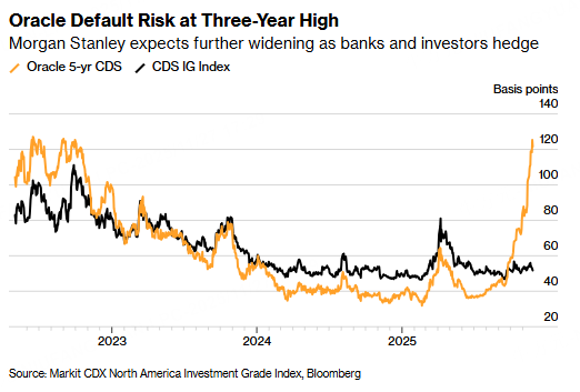 Oracle CDS have underperformed the broader investment-grade CDX index and Oracle corporate bonds have underperformed the Bloomberg high-grade index amid the jump in hedging demand and the weakening sentiment. Concerns have also started to weigh on Oracle’s stock, which the analysts said may incentivize management to outline a financing plan on the upcoming earnings call, including details on Stargate, data centers and capital spending.