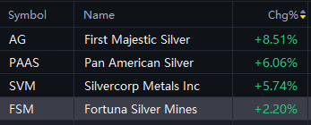 Silver stocks jumped in Friday trading. First Majestic rose 9%; Silvercorp Metals, Pan American Silver rose 6%; Fortuna rose 2%.