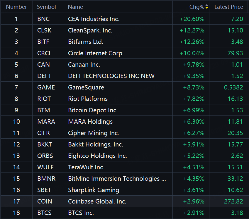 Crypto shares surged on Friday. CEA Industries up over 20%; CleanSpark, Bitfarms up over 12%; Circle up 10%; Canaan, DeFi Tech, GameSquare up around 9%.