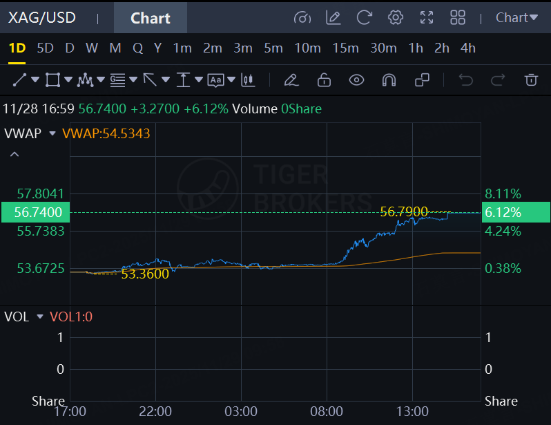 Spot prices surged as much as 6.12% to about $56.74 an ounce. The white metal has been supported by rising hopes of a Federal Reserve interest-rate cut in December, inflows into bullion-backed exchange-traded funds and ongoing supply tightness.