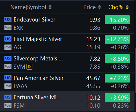 Silver stocks jumped on Friday. Endeavour Silver up over 15%; First Majestic Silver up nearly 13%; Silvercorp up about 9%.