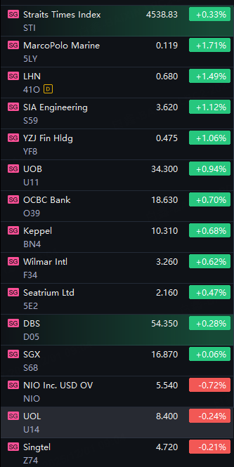 Singapore stocks opened higher on Monday. STI rose 0.4%; Marco Polo Marine, LHN, YZJ Fin, SIA Engineering and UOB up 1%.