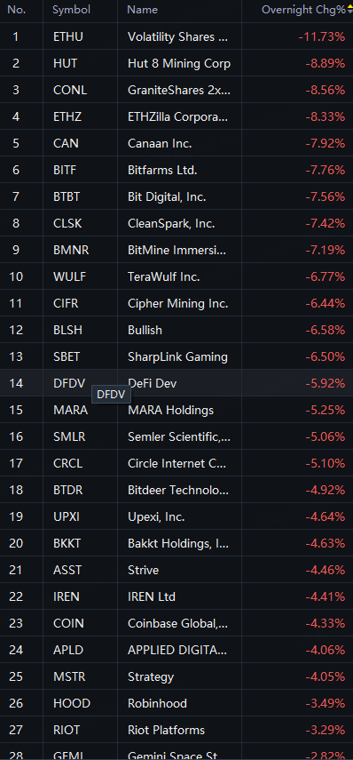 Crypto Shares Sink in Overnight Trading; Hut 8 down 9%; ETHZilla, Canaan and Bitfarms down 8%; Bit Digital, CleanSpark and BitMine down 7%.