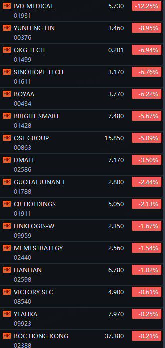 HK crypto stocks fall as Bitcoin drops to $87,000; IVD Medical down 12%; Yunfeng Fin down 9%; OKG Tech and Sinohope down 7%; Boyaa and Bright Smart down 6%.