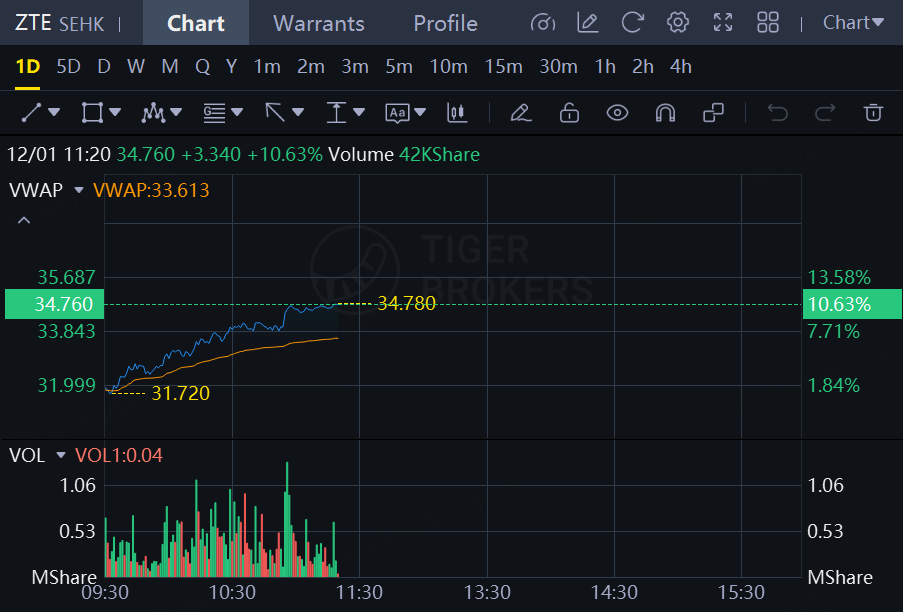 ZTE shares rose over 10% in Hong Kong. The AI smartphone jointly developed by ByteDance and ZTEis set to launch in early December, according to comprehensive Chinese media reports.